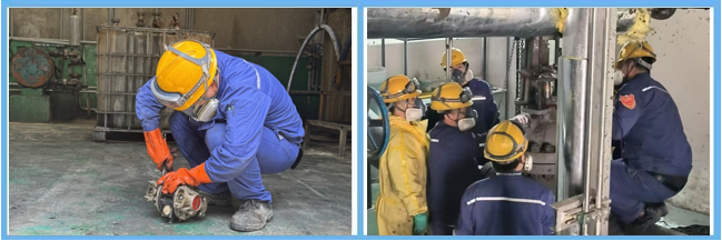 現(xiàn)場(chǎng)作業(yè)區(qū),員工正在一絲不茍地對(duì)設(shè)備部件進(jìn)行拆解檢查,杜絕安全隱患的同時(shí)保證設(shè)備能夠高效運(yùn)轉(zhuǎn)。不遠(yuǎn)處,生產(chǎn)技術(shù)處處長(zhǎng)助理正帶領(lǐng)幾名青年技術(shù)員圍著一臺(tái)核心設(shè)備開展檢修保養(yǎng),一邊拆解部件檢查磨損情況,一邊細(xì)致講解設(shè)備運(yùn)行原理與維護(hù)要點(diǎn),教學(xué)的身影與現(xiàn)場(chǎng)作業(yè)的場(chǎng)景相映,構(gòu)成了一幅忙碌而有序的生產(chǎn)畫面。